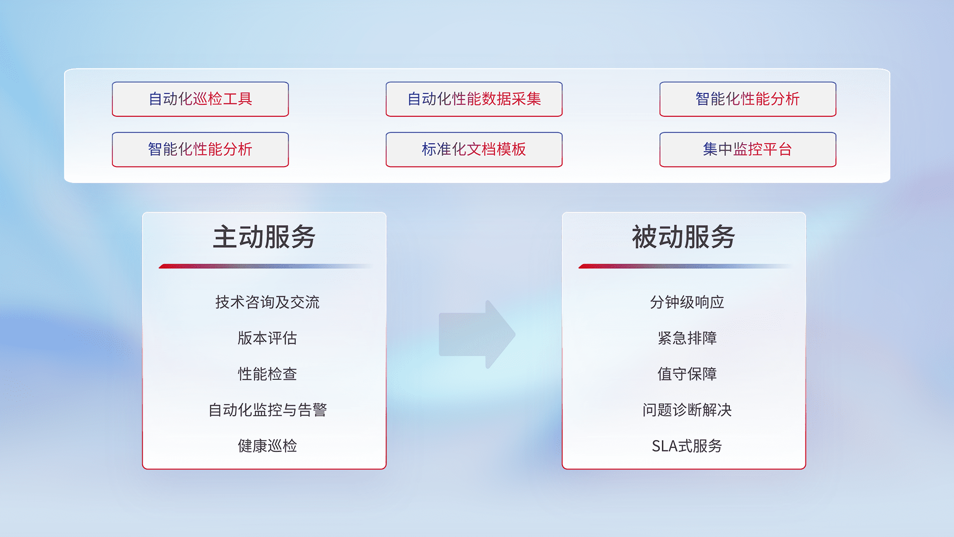 智能化工具和标准化文档,,,,保障服务质量,,,,提供主动服务(包含技术咨询、、、版本评估、、、、性能检查、、、、自动化监控与告警、、健康巡检)和被动服务包含(分钟级响应、、、紧急排障、、、值守保障、、、问题诊断解决、、SLA服务)。。