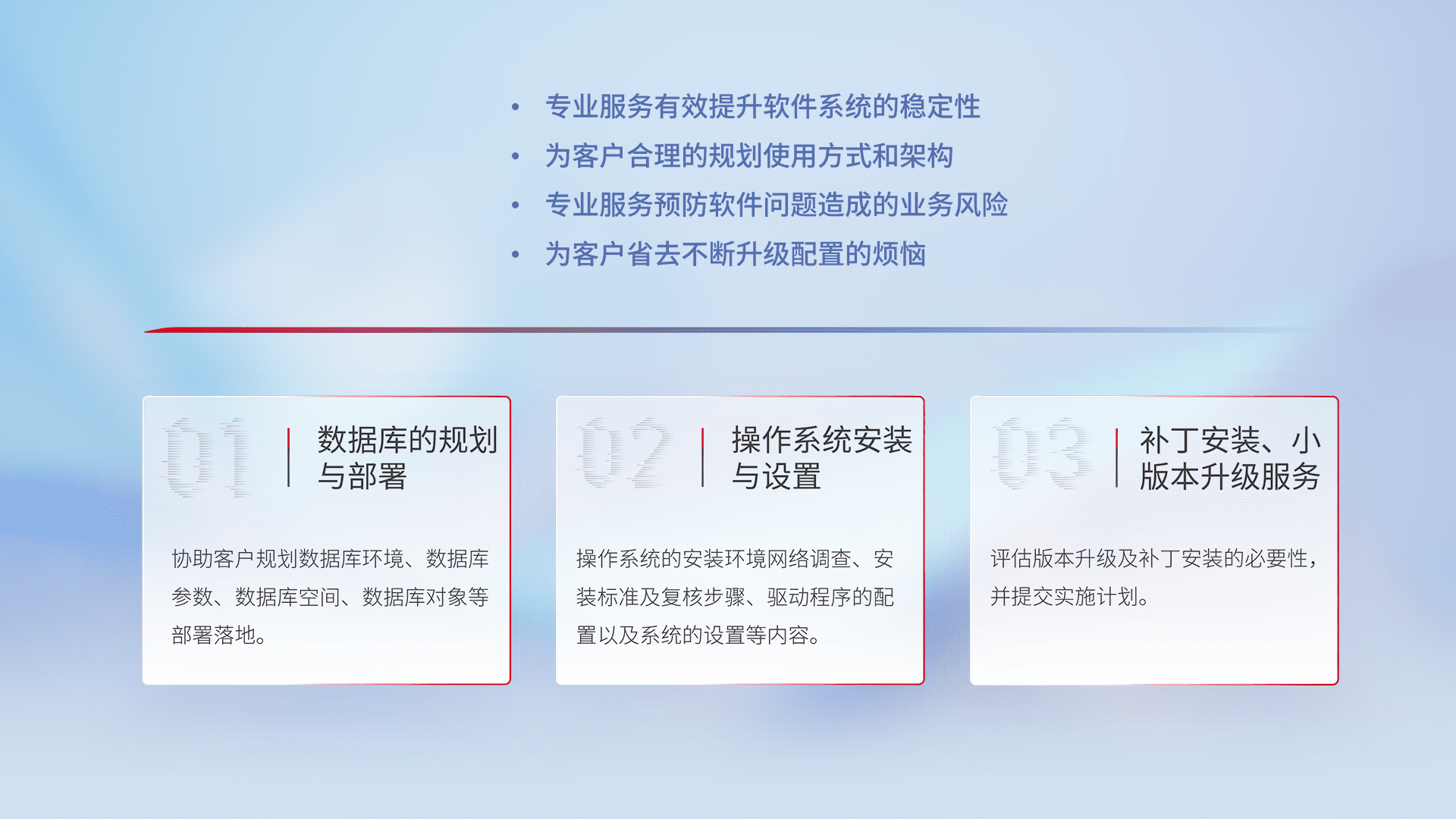 为客户提供软件规模升级、、、快速部署、、、、按需配置的专业服务,,从数据库的规划与部署到操作系统的安装与设置,,,再到补丁安装和小版本升级提供支持。。